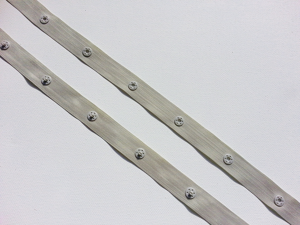 Praktisches Webband mit eingearbeiteten Druckknopfen. Abstand zwischen den Knöpfen 5 cm. Das Band ist 2 cm breit.