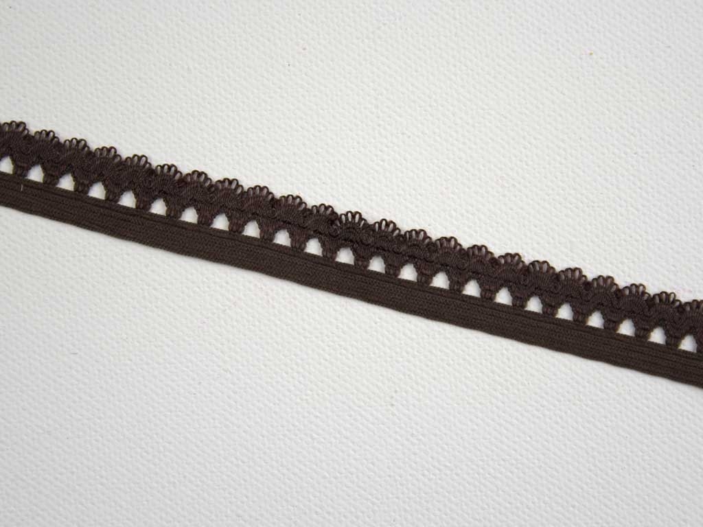 Ein elastisches Zierband mit gebogener Rüschenkante in schokobraun.