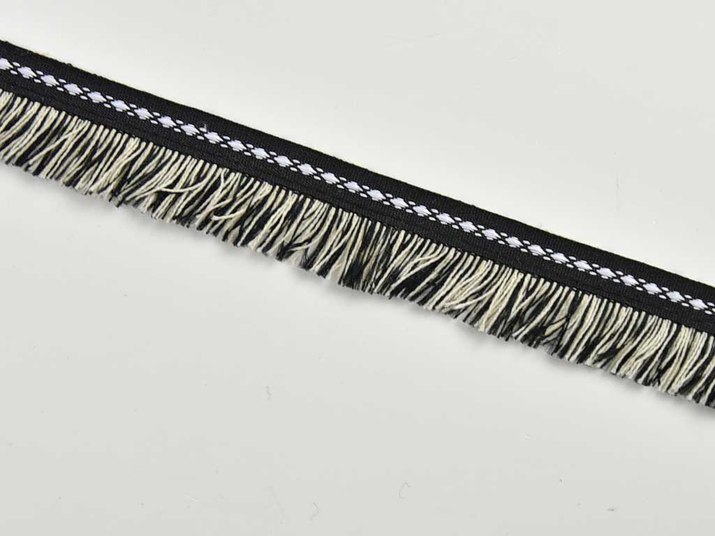 Ein 25mm breites Jacquard Webband mit schwarz ecruefarbenem Ethnomuster und Fransen aus Baumwolle. Perfekt für den Boho Style!