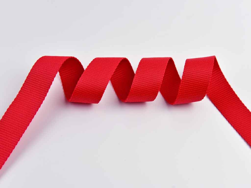 Ein strapazierfähiges Gurtband aus Polypropylen in der Breite 3 cm (30 mm) in der Farbe Rot. Das Band ist weich und geschmeidig und hat eine relativ glatte und leicht glänzende Oberfläche.