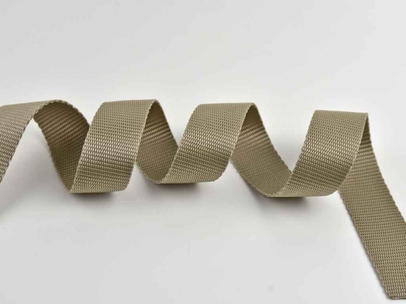 Ein strapazierfähiges Gurtband aus Polypropylen in der Breite 3 cm (30 mm) in der Farbe Taupe. Das Band ist weich und geschmeidig und hat eine relativ glatte und leicht glänzende Oberfläche.