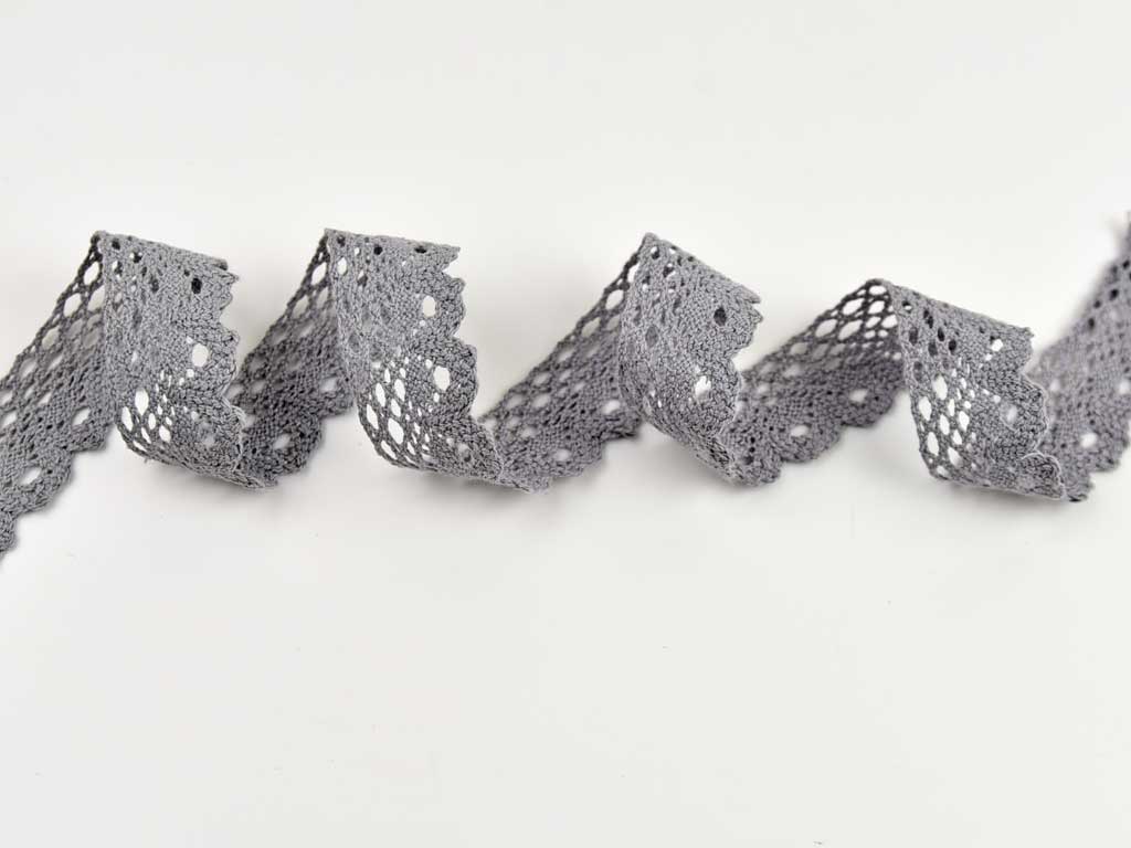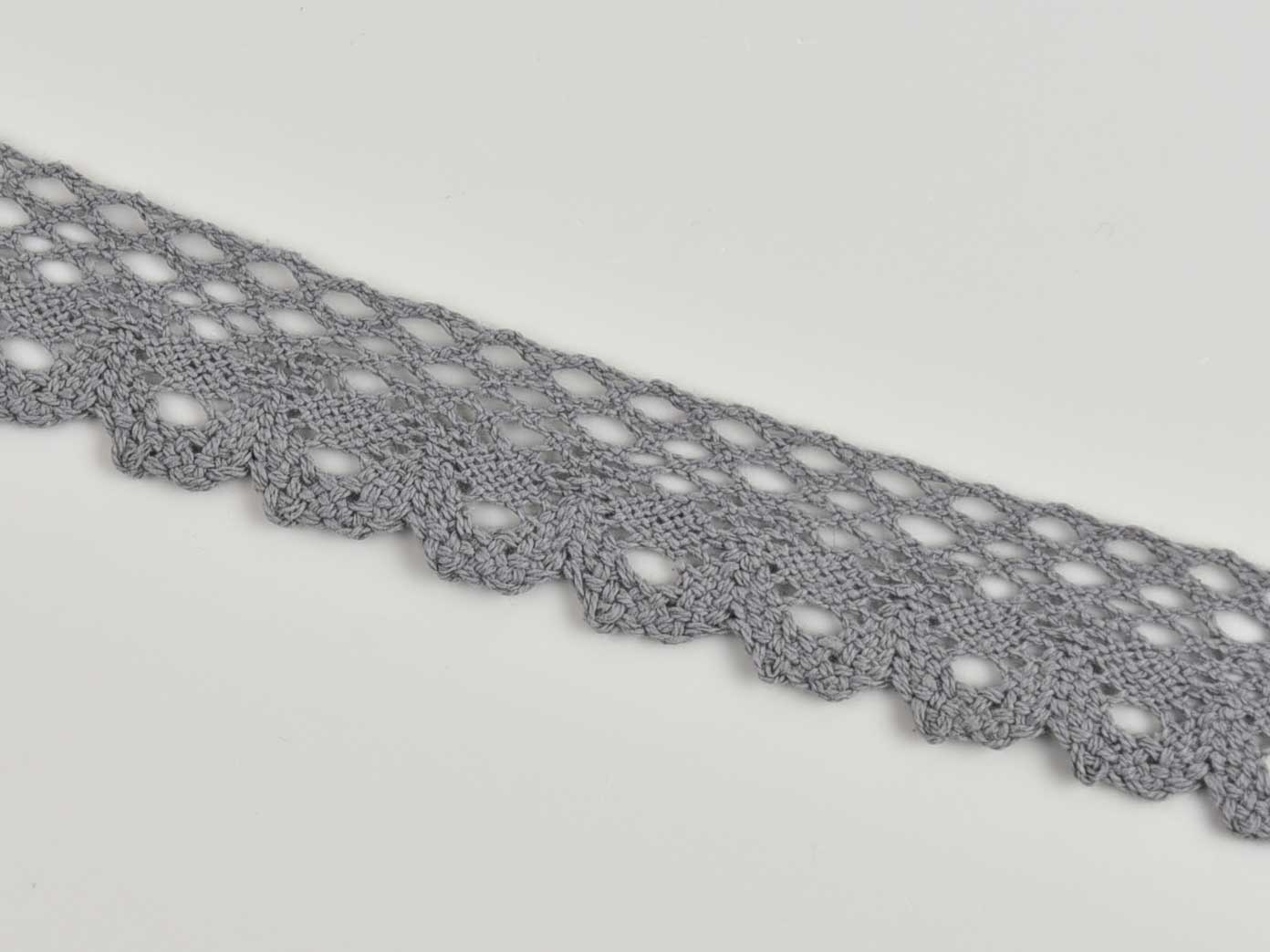 Eine wunderschöne, weiche Häkelspitze mit Bogenkante in grau.