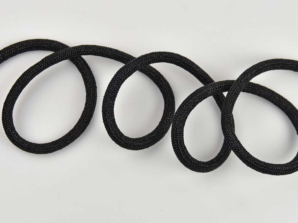 Eine runde, kompakte Kordel in schwarz-metallic. Die Kordel ist 8 mm breit und glänzend. Bestens geeignet zum Einziehen in Kapuzenpullis, Jogginghosen, Röcke, Shorts, Turnbeutel etc.