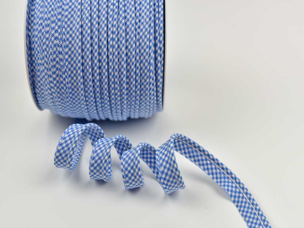 Ein hochwertiges Paspelband aus 100% Baumwolle mit jeansblau-weißem Vichykaro. Die Paspel ist rund und 2,5 mm breit, das komplette Paspelband ist 15 mm breit.