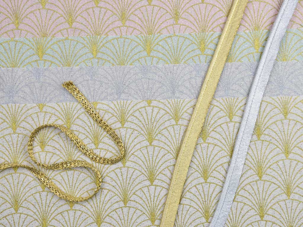 Ein hochwertiges Paspelband in silber metallic. Die Paspel ist rund und 2,5 mm breit, das komplette Paspelband ist 15 mm breit.