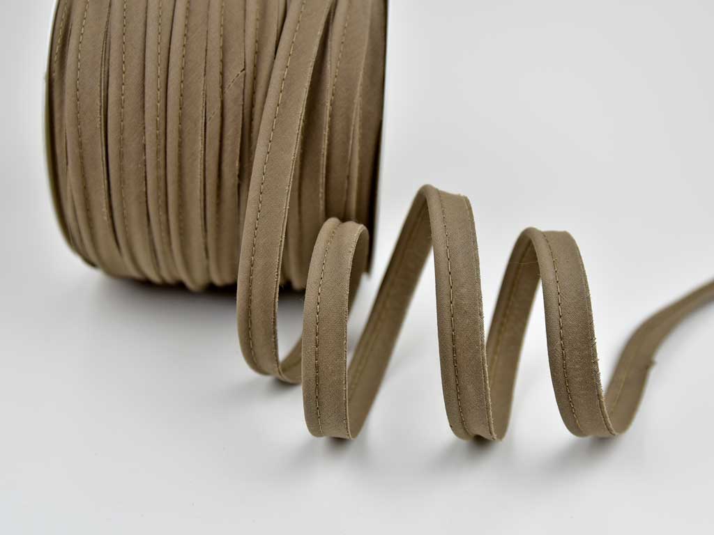 Ein hochwertiges Paspelband aus 100% Baumwolle in pastellbraun. Die Paspel ist rund und 2,5 mm breit, das komplette Paspelband ist 15 mm breit.