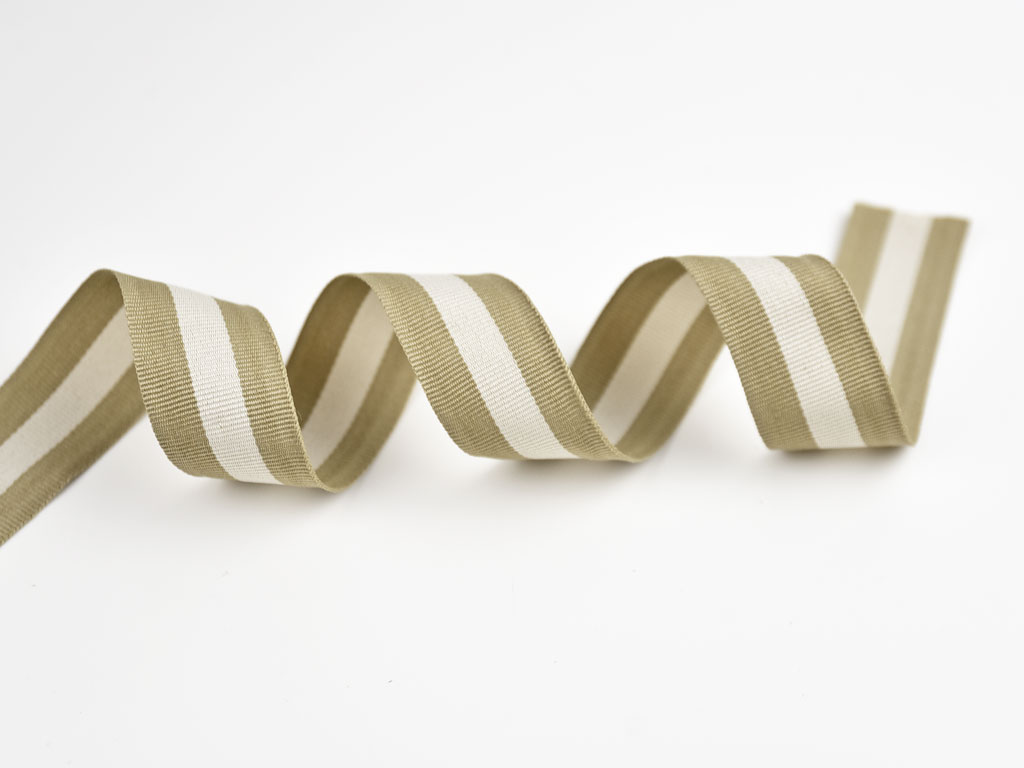 Ein 3 cm breites Ripsband mit zwei beigen Streifen und einem ecruefarbenen Mittelstreifen. Jeder Streifen ist 1 cm breit.