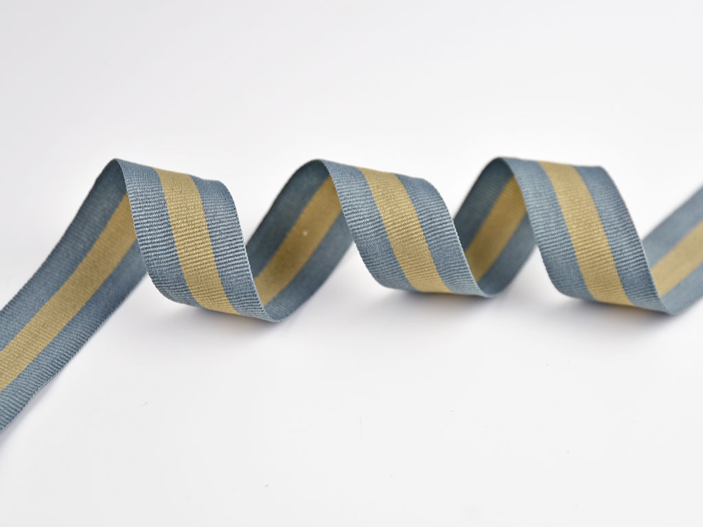 Ein 3 cm breites Ripsband mit zwei grauen Streifen und einem beigen Mittelstreifen. Jeder Streifen ist 1 cm breit.