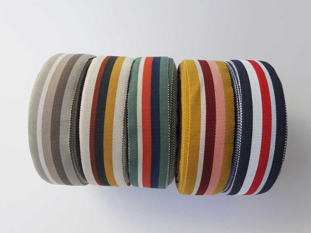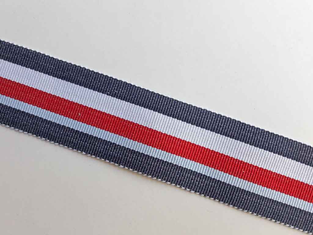 Ein 3,5 cm breites, gestreiftes Ripsband aus 100% Baumwolle. Die Streifen von unterschiedlicher Breite sind Jeansblau, Hellblau, Rot und Weiß.