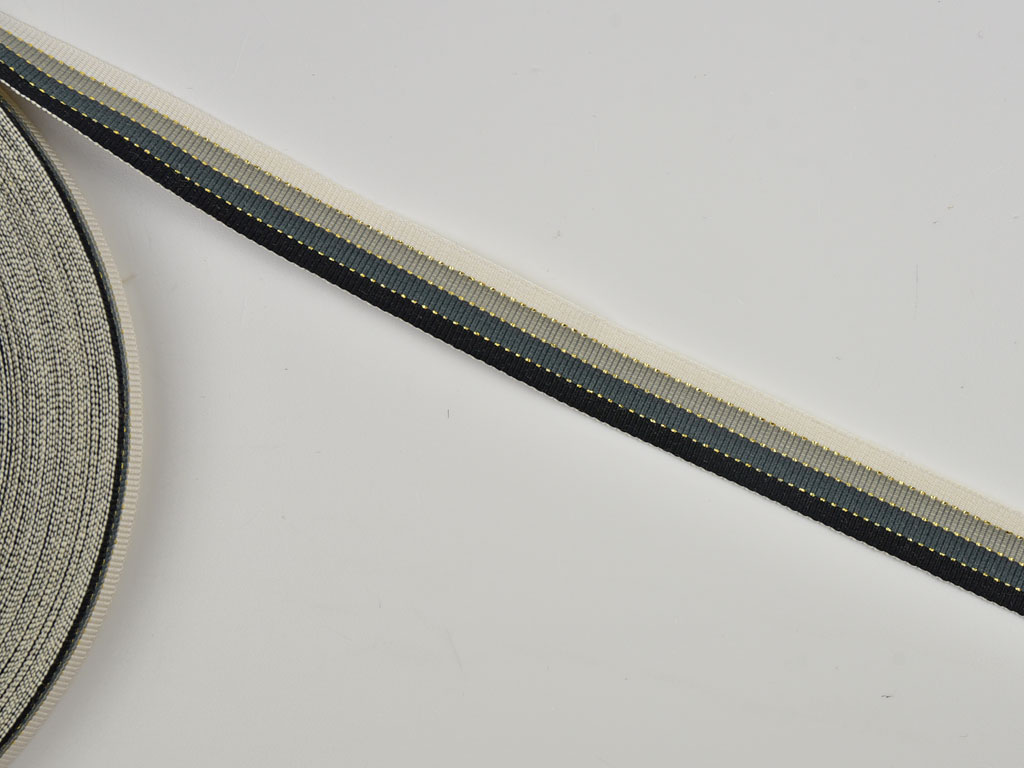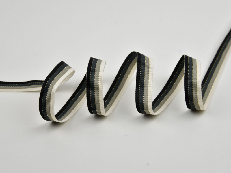 Ein 16 mm breites, gestreiftes Webband in creme, hellgrau, dunkelgrau und schwarz. Zwischen den Streifen ist ein feiner Glitzerstreifen in gold.