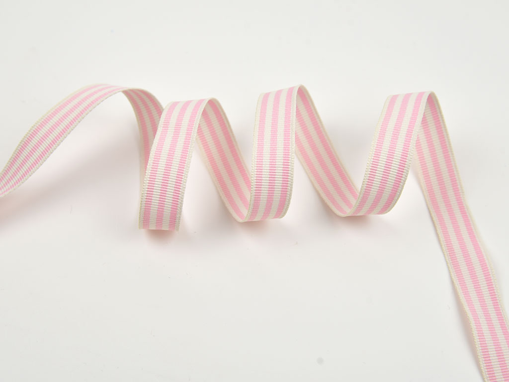 Ein klassisches Ripsband mit cremeweißen und rosa Streifen. Das Band ist 15 mm breit.