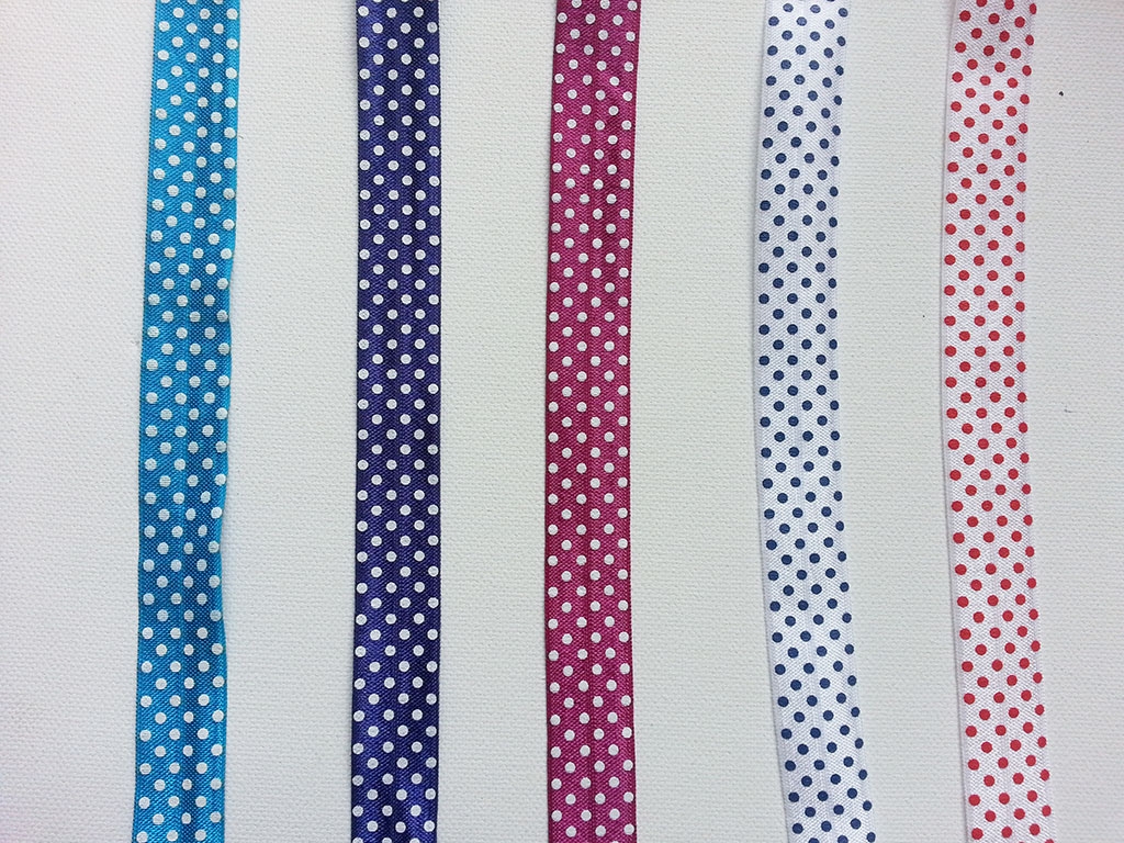 Elastisches 2 cm breites Falzband in gelb mit kleinen weißen Punkten. Die Punkte sind 2mm groß.