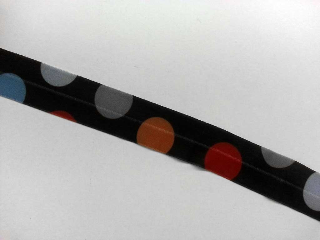 Elastisches Falzband in dunkelgrau mit großen bunten Punkten.
