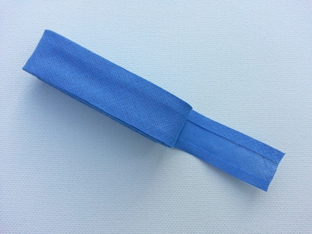 3 m Baumwoll-Schrägband in stahlblau. Vorgefalzt auf 20 mm Breite. Zusammengeklappt und angenäht ist es dann nur noch 1 cm breit.