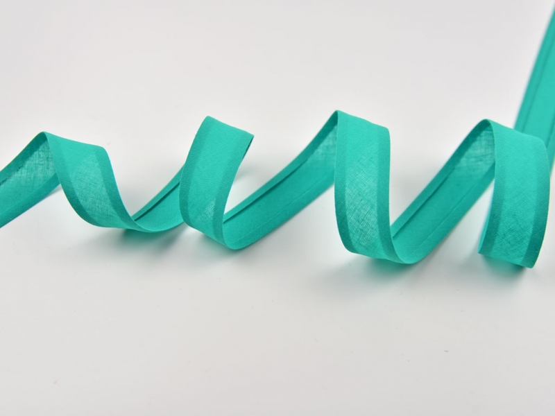 Ein hochwertiges Schrägband aus 100% Baumwolle in hellem Aquamarin. Das Schrägband ist wie auf dem Bild abgebildet vorgefalzt auf 2,5 cm Breite (die eingeklappten Seitenteile sind 0,6 cm breit). Angenäht hat das Schrägband dann eine Breite von 1,2 cm.