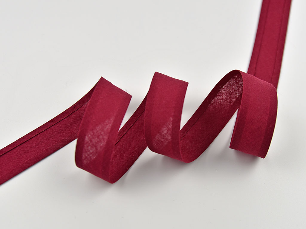 Ein hochwertiges Schrägband aus 100% Baumwolle hier in der Farbe Weinrot. Das Schrägband ist wie auf dem Bild abgebildet vorgefalzt auf 2,5 cm Breite (die eingeklappten Seitenteile sind 0,6 cm breit). Angenäht hat das Schrägband dann eine Breite von 1,2 cm.