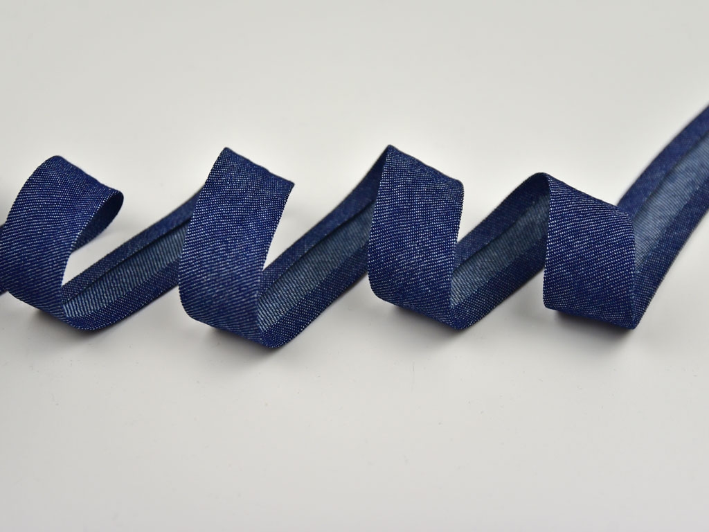 Ein hochwertiges Schrägband aus dunkelblauem Jeansstoff. Das Schrägband ist wie auf dem Bild abgebildet vorgefalzt auf 2,5 cm Breite (die eingeklappten Seitenteile sind 0,6 cm breit). Angenäht hat das Schrägband dann eine Breite von 1,2 cm.