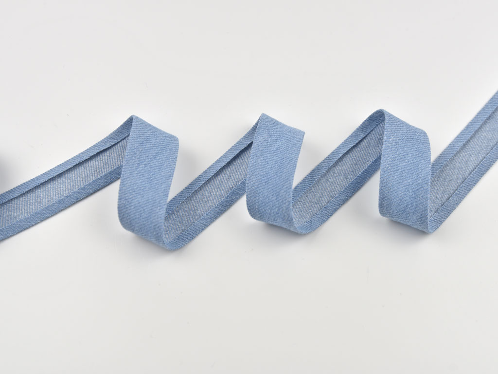 Ein hochwertiges Schrägband aus hellblauem Jeansstoff. Das Schrägband ist wie auf dem Bild abgebildet vorgefalzt auf 2,5 cm Breite (die eingeklappten Seitenteile sind 0,6 cm breit). Angenäht hat das Schrägband dann eine Breite von 1,2 cm.