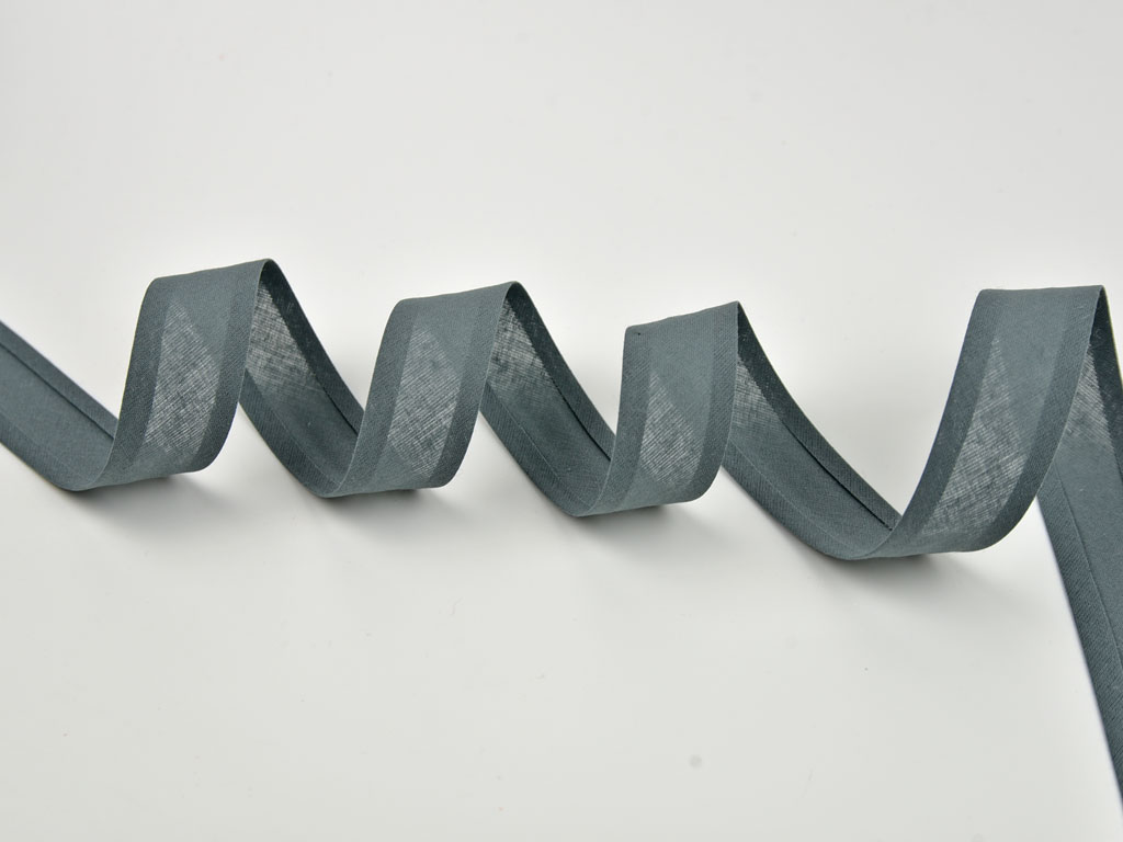 Ein hochwertiges Schrägband aus 100% Baumwolle hier in der Farbe mausgrau. Das Schrägband ist wie auf dem Bild abgebildet vorgefalzt auf 2,5 cm Breite (die eingeklappten Seitenteile sind 0,6 cm breit). Angenäht hat das Schrägband dann eine Breite von 1,2 cm.