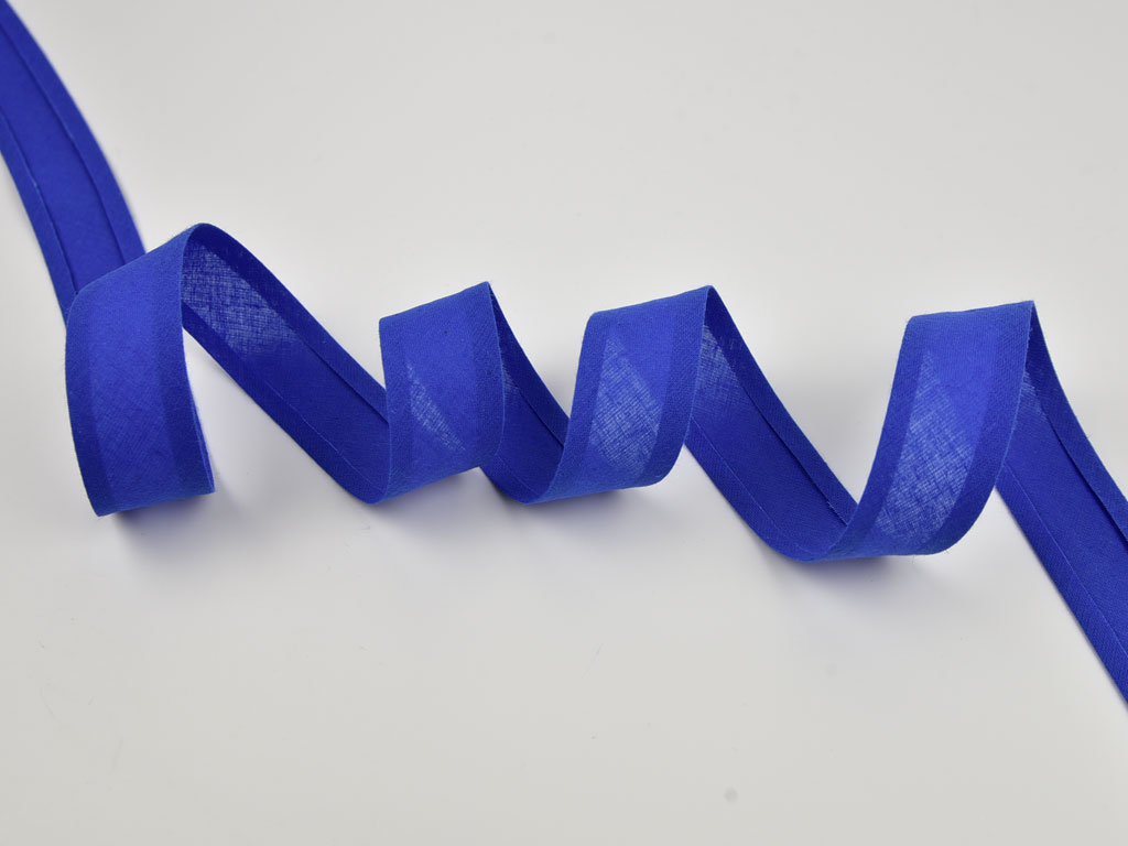 Ein hochwertiges Schrägband aus 100% Baumwolle hier in der Farbe royalblau. Das Schrägband ist wie auf dem Bild abgebildet vorgefalzt auf 2,5 cm Breite (die eingeklappten Seitenteile sind 0,6 cm breit). Angenäht hat das Schrägband dann eine Breite von 1,2 cm.