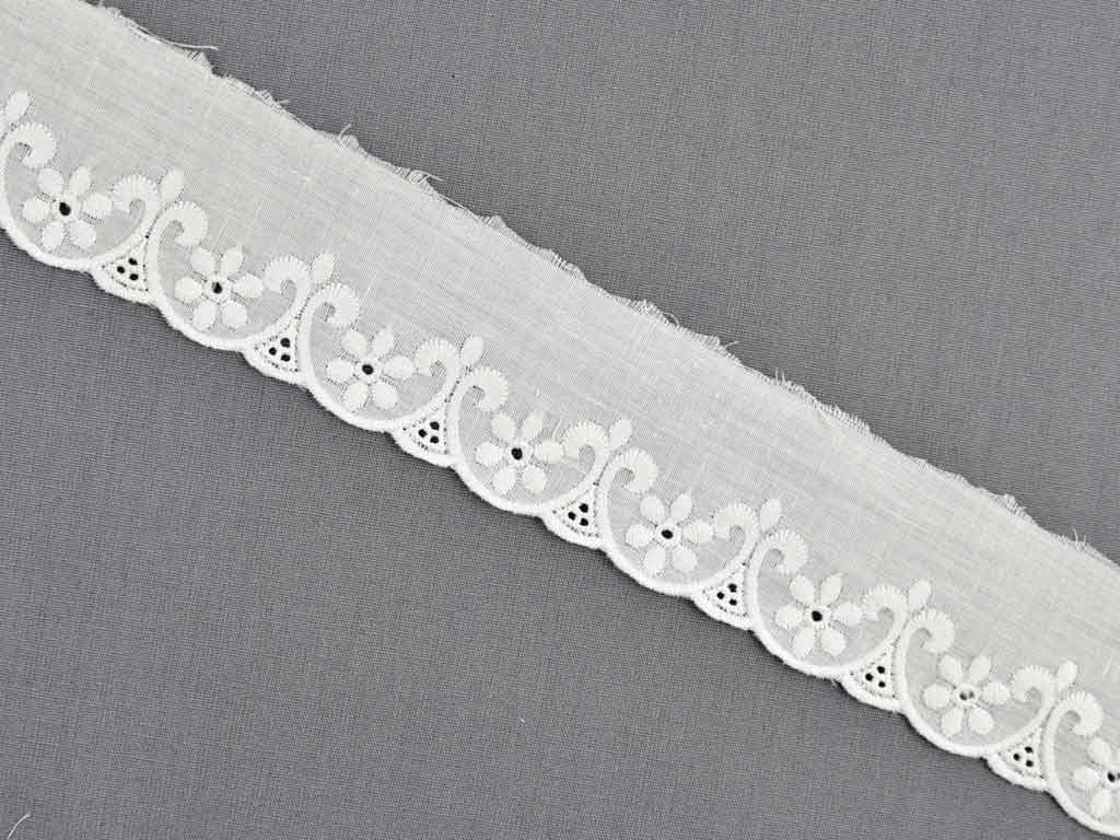 Eine hochwertige, weiße Wäschespitze aus Baumwolle mit Bogenkante und bestickten Blumen/Lochstickereien. Die Stickerei ist 20 mm breit.