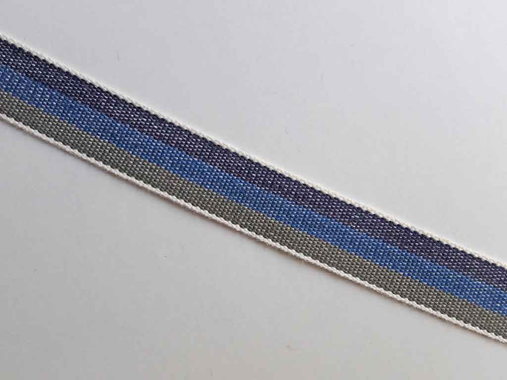 Ein 1,5 cm breites, gestreiftes Webband aus 100% Baumwolle. Die inneren Streifen in Khaki, Blau und Navyblau sind 4 mm breit und werden von zwei ganz schmalen Streifen in Cremeweiß eingerahmt.