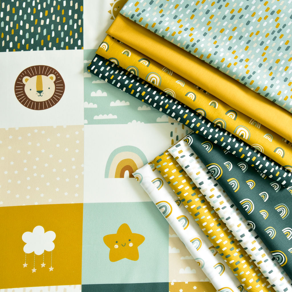 Ein matt dunkelgrüner Baumwollstoff bedruckt mit ockergelben,weißen und mintgrünen Pinselstrichen. Die Webware ist weich im Griff und glatt. Sie ist unelastisch und lässt sich auch von Nähanfängern gut vernähen. Die Stoffrückseite ist unbedruckt.