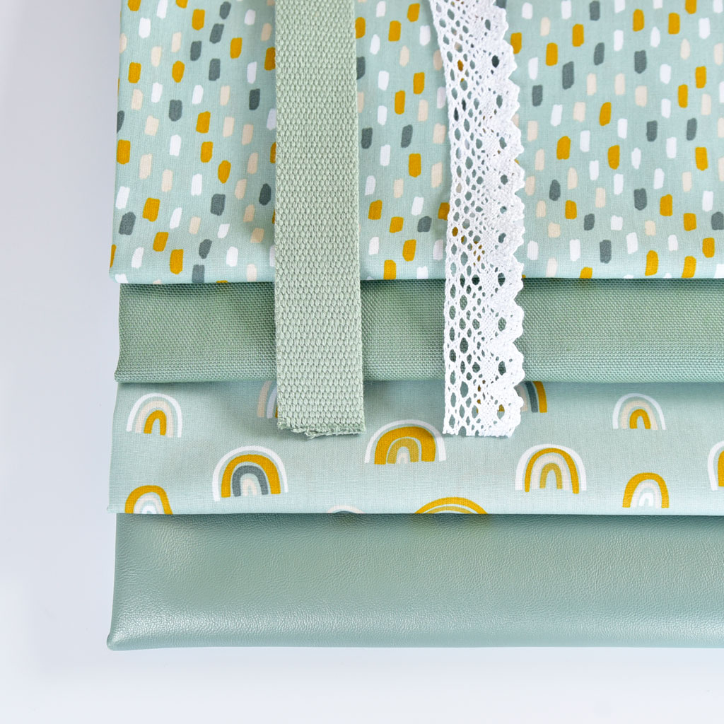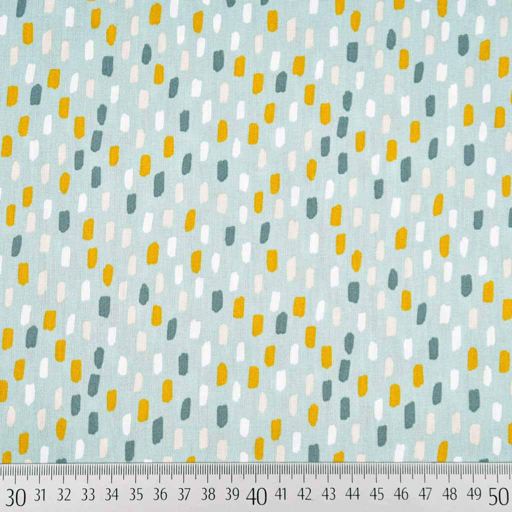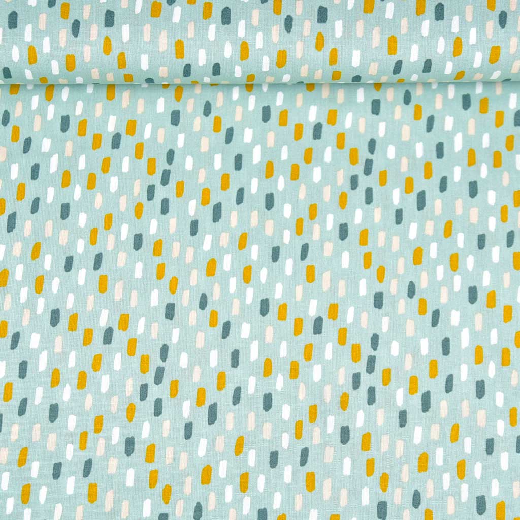 Ein hellmintgrüner Baumwollstoff bedruckt mit dunkelmintgrünen, ockergelben,weißen und nudefarbenen Pinselstrichen. Die Webware ist weich im Griff und glatt. Sie ist unelastisch und lässt sich auch von Nähanfängern gut vernähen. Die Stoffrückseite ist unbedruckt.