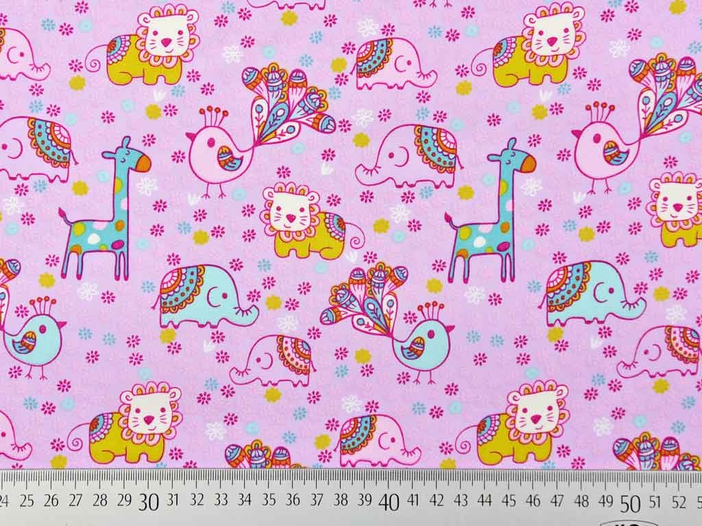 Ein rosa, weicher Baumwollstoff mit bunten Zootieren: mintfarbene Elefanten und Giraffen, hellrosa Vögeln und senfgelbe Löwen. Die Tiere sind mit einem farbenfrohen Mandaladesign geschmückt und von kleinen bunten Streublümchen umgeben.