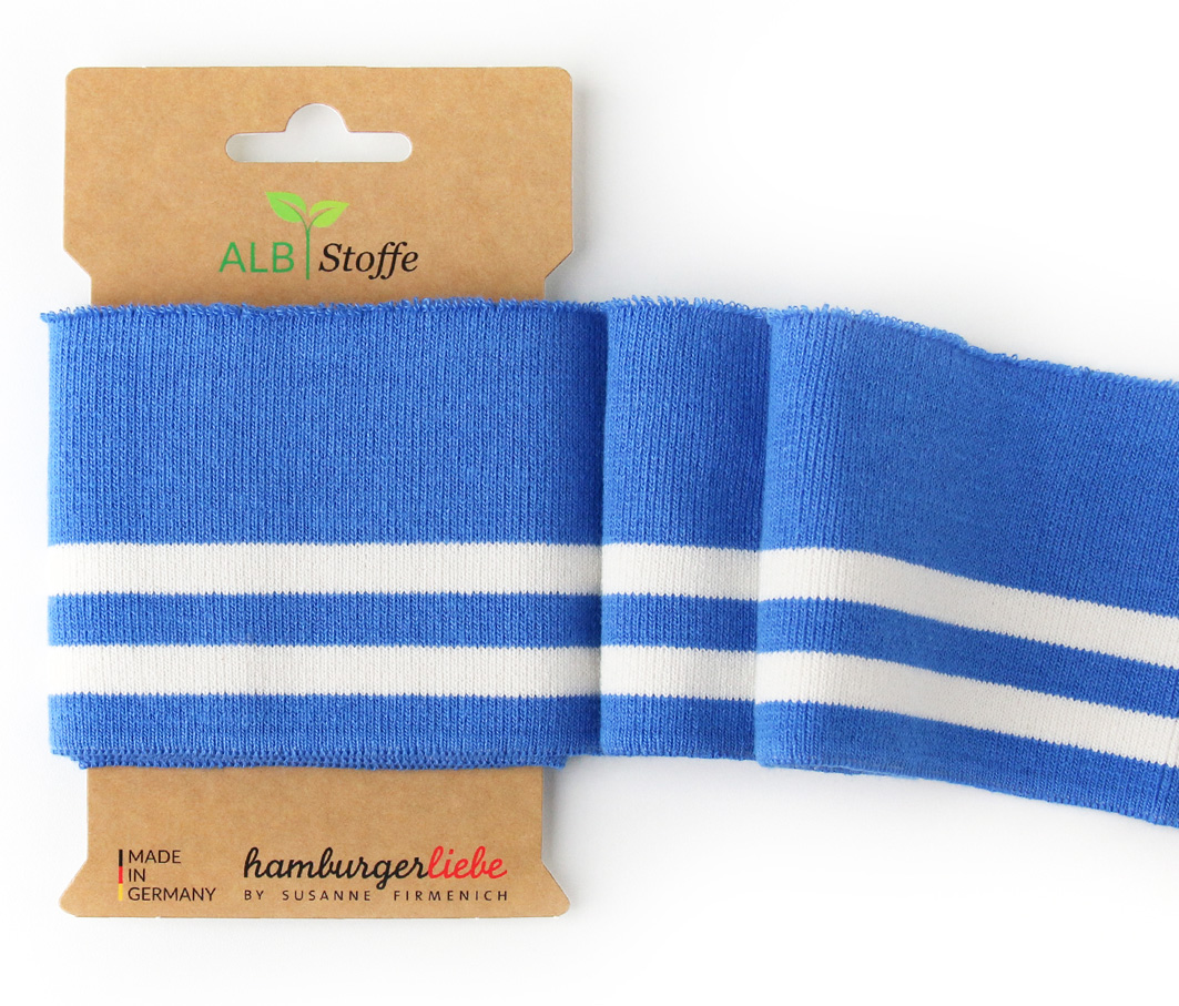 Ein super schönes Flachstrick Bündchen in himmelblau mit zwei cremeweißen Streifen ganz im College Stil. Das Bündchen kommt aus der Cuff Me College Kollektion von Hamburger Liebe und wurde von Albstoffe in Deutschland produziert. Die Bündchen sind aus Bio-Baumwolle und GOTS zertifizert