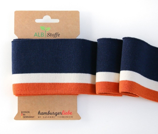 Ein super schönes Flachstrick Bündchen in dunkelblau mit weißem und Zimt-farbenem Streifen ganz im College Stil.