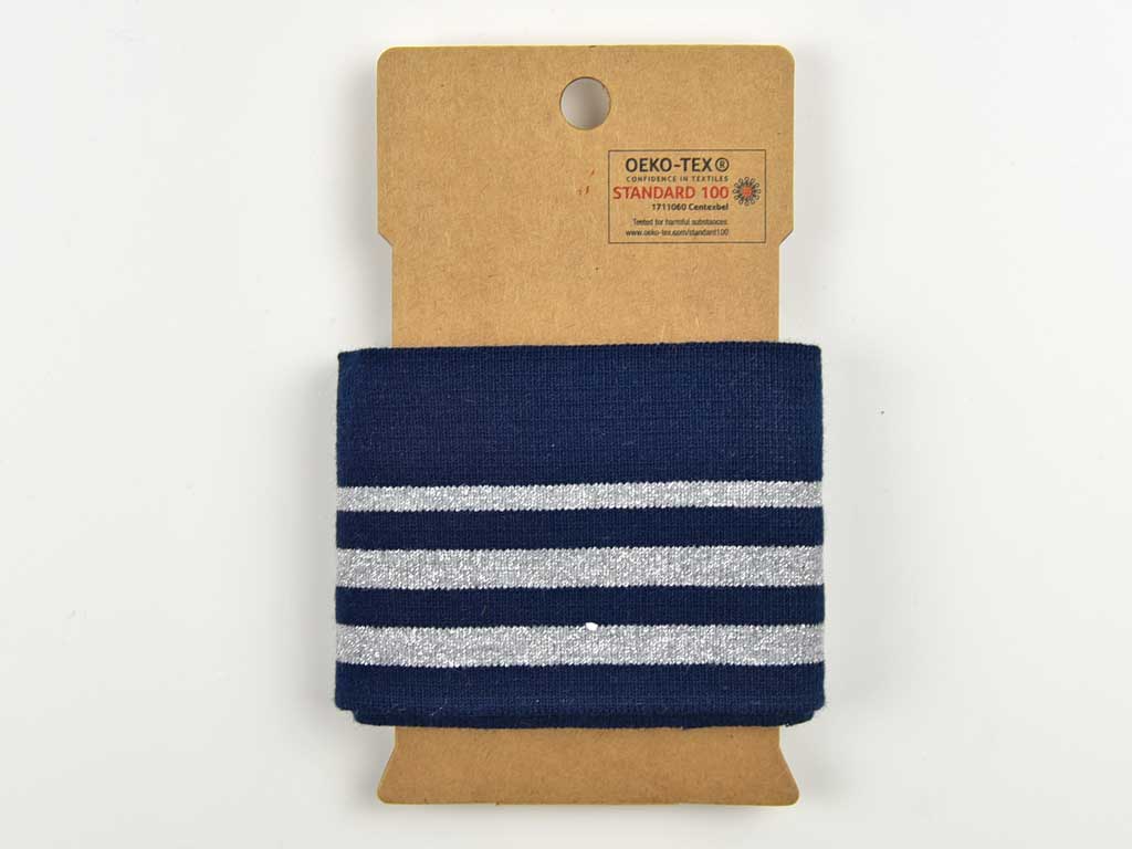 Ein schönes Fertigbündchen im College Stil in dunkelblau mit 3 silberfarbigen Glitzerstreifen. Das Bündchen hat eine fertige Kante und muss nur noch angenäht werden.