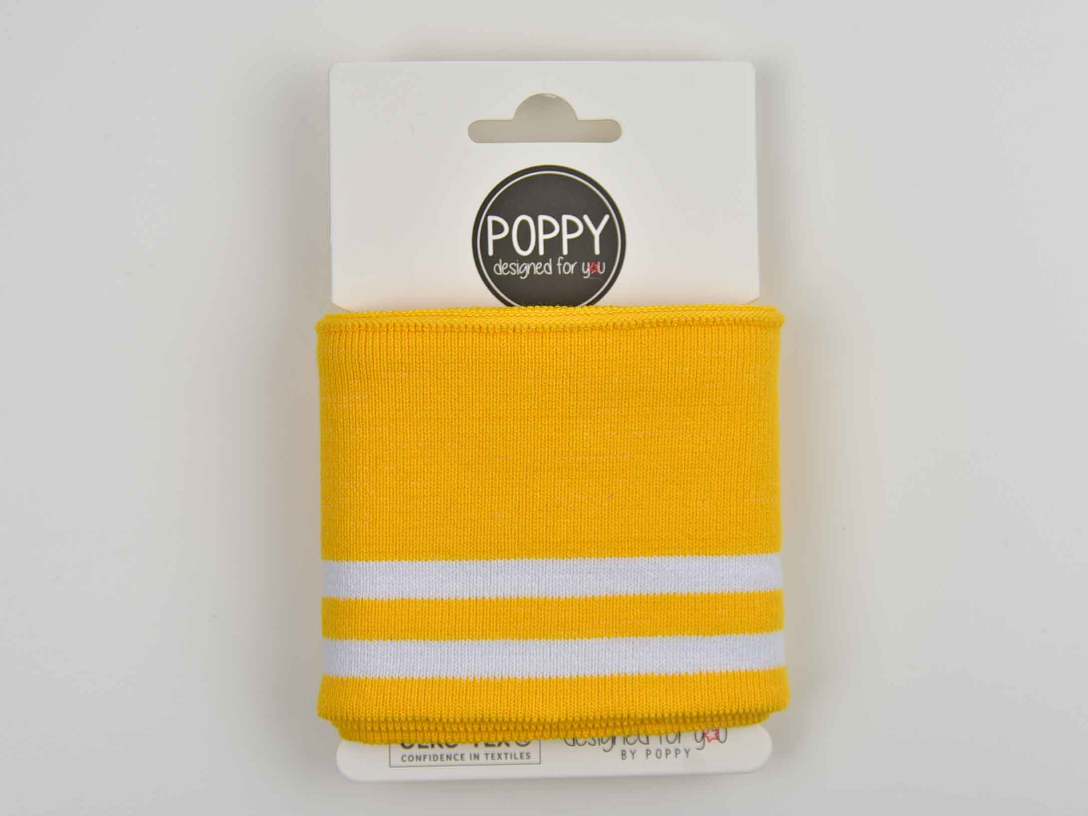Aus der Poppy Kollektion ein gelbes Fertigbündchen im College Stil mit zwei weißen Streifen. Das Bündchen hat eine fertige Kante und muss nur noch angenäht werden.