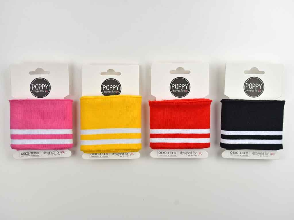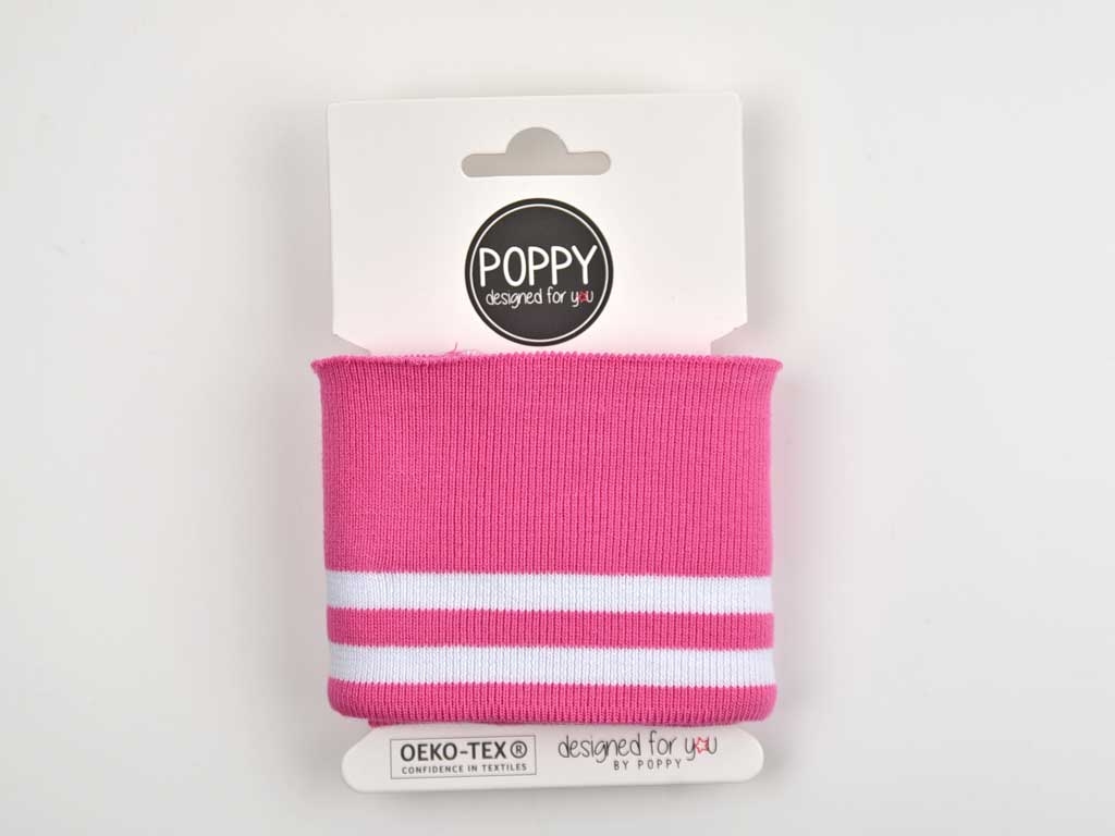 Aus der Poppy Kollektion ein hellpinkes Fertigbündchen im College Stil mit zwei weißen Streifen. Das Bündchen hat eine fertige Kante und muss nur noch angenäht werden.
