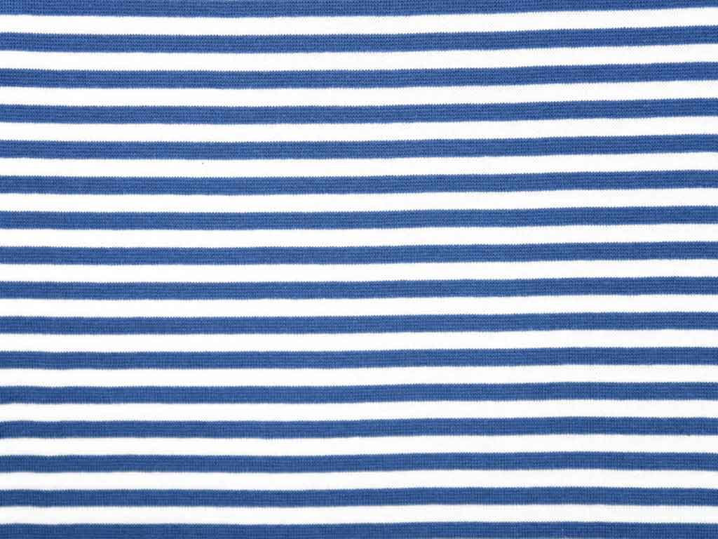 Ein garngefärbtes, elastisches Bündchen im Glattstrick mit blauen und weißen Streifen. Die Streifen sind 5 mm breit.