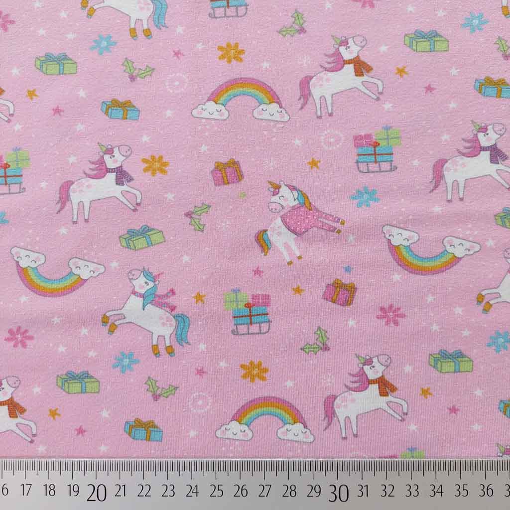 Ein rosa Jerseystoff bedruckt mit weißen Einhörnern mit pinker Mähne und Schweif, sowie bunten Regenbogen, rosa, hellblauen und hellgrünen Geschenken und kleinen Sternen. Der Shirtstoff ist elastisch und weich im Griff. Die Stoffrückseite ist nicht bedruckt. d.h. weiß.