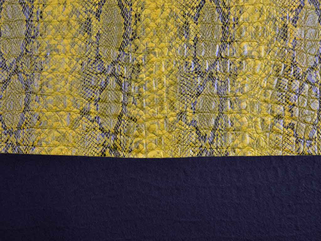 Ein schönes Kunstleder mit Krokodilprägung und Schlangendruck in Ocker und Schwarz. Das Kunstleder dehnt sich leicht und bietet hohen Tragekomfort. Das Lederimitat hat eine schwarze Filzrückseite.