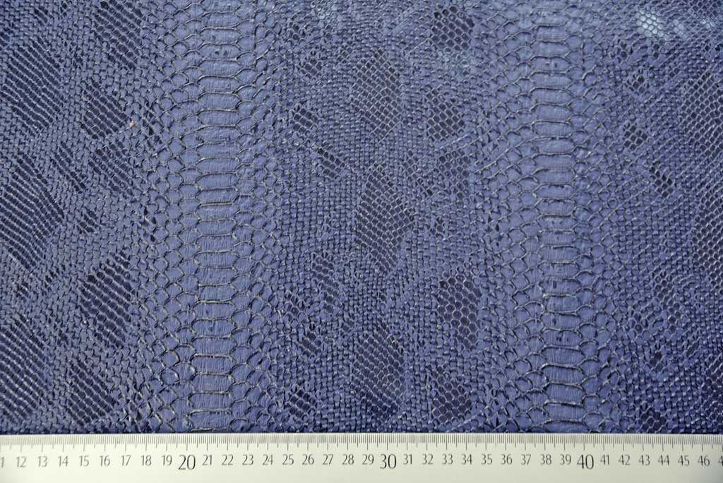 Ein dickes, kräftiges Schlangenlederimitat in dunkelblau mit strukturierter Oberfläche und angerautem (weichem) schwarzem Geweberücken. Das Lederimitat ist leicht dehnbar.