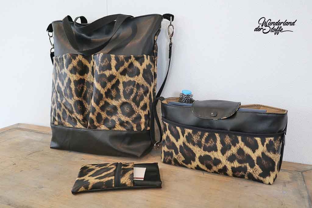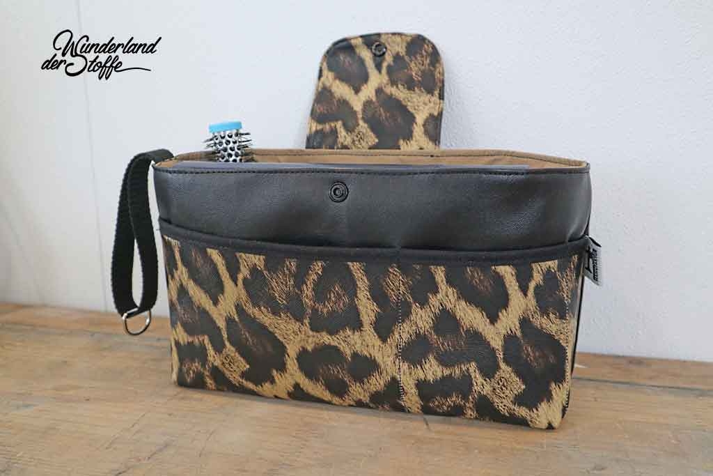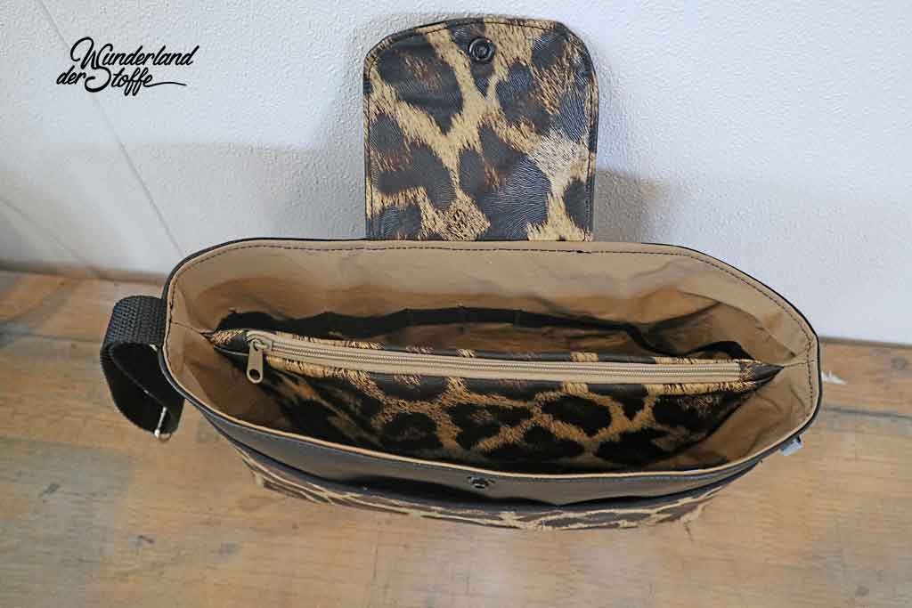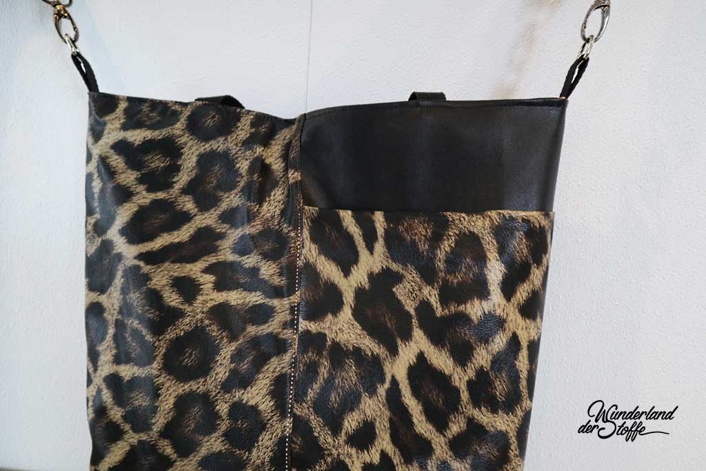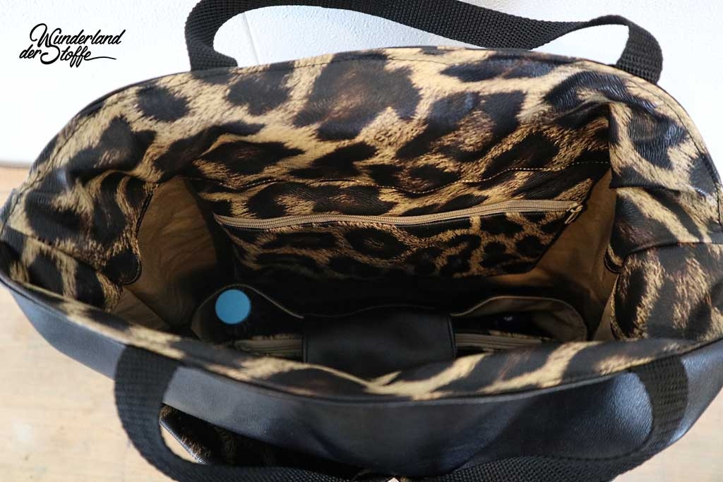 Ein gut elastisches Lederimitat mit Leopardenmuster in hellem Ocker, Braun und Dunkelbraun. Die Oberfläche hat eine geprägte Optik, die die Fellstruktur imitiert, dadurch wirkt der Stoff sehr echt. Die Rückseite ist aus weißem, glattem Gewebe.