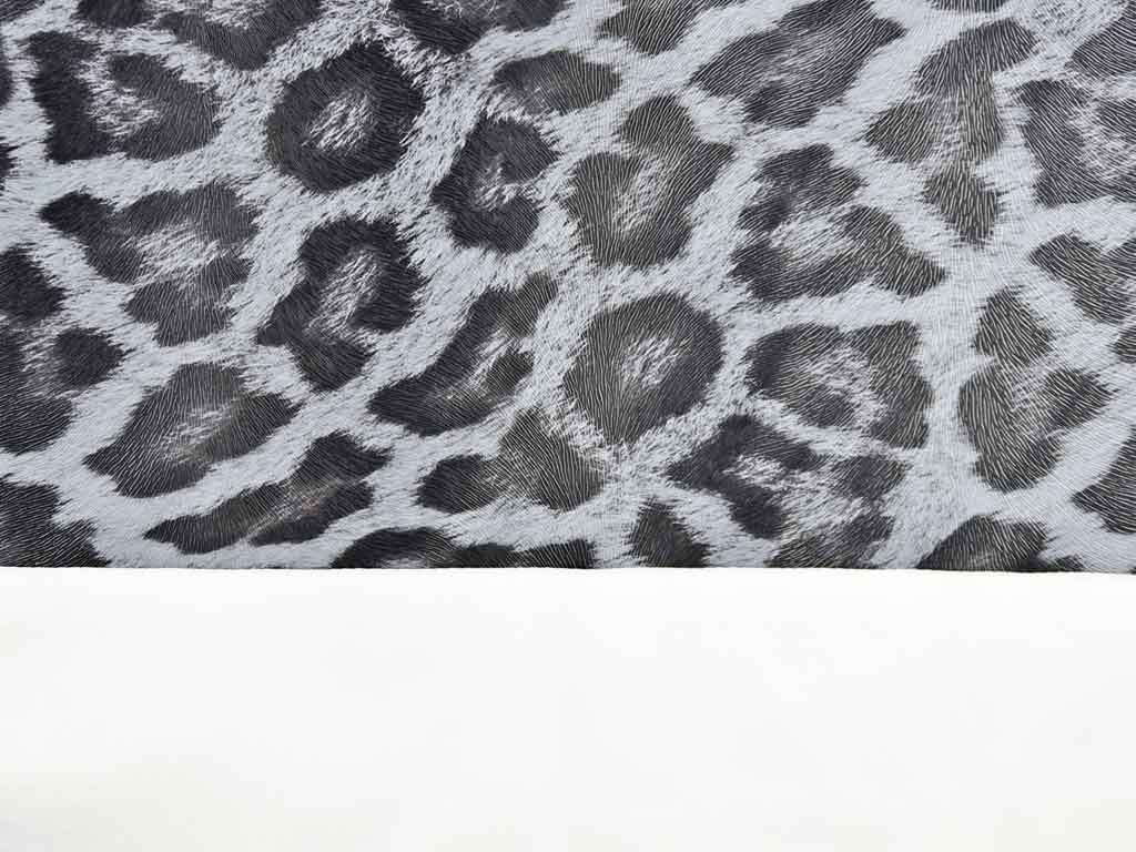 Ein gut elastisches Lederimitat mit Leopardenmuster in Grau, Dunkelgrau und Schwarz. Die Oberfläche hat eine geprägte Optik, die die Fellstruktur imitiert,  dadurch wirkt der Stoff sehr echt. Die Rückseite ist aus weißem, glattem Gewebe.