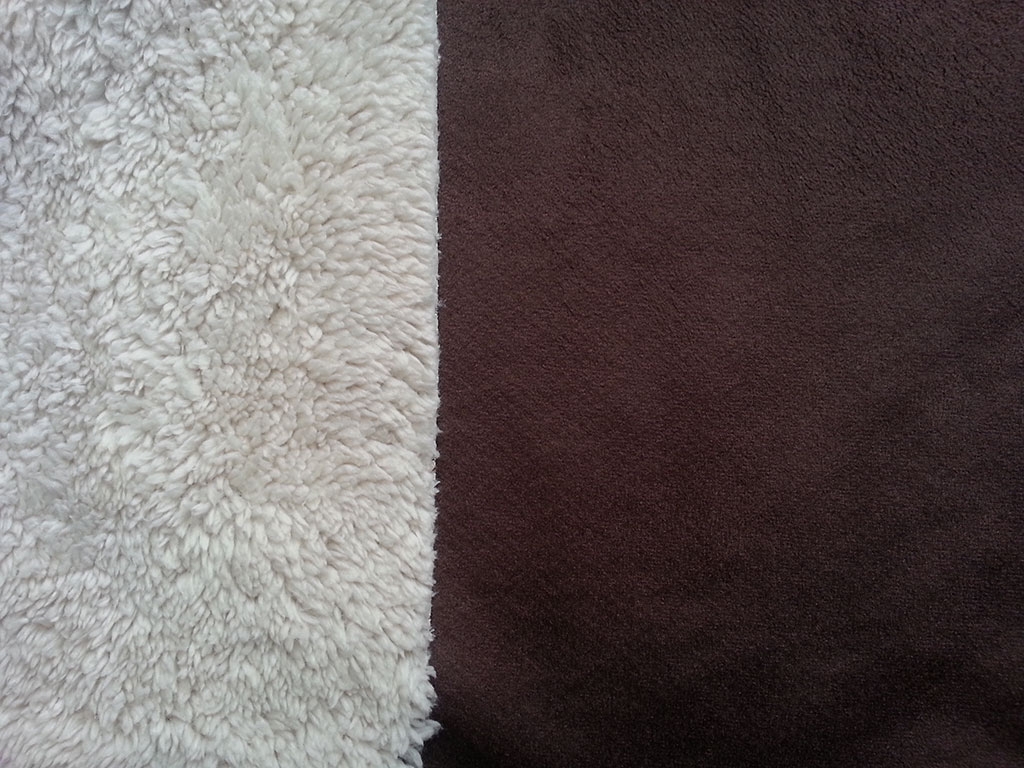 Ein weiches, beidseitig verwendbares Wildleder Imitat (Fake Suede) in schokobraun (dunkelbraun) mit naturfarbenem Teddyfutter auf der anderen Seite.