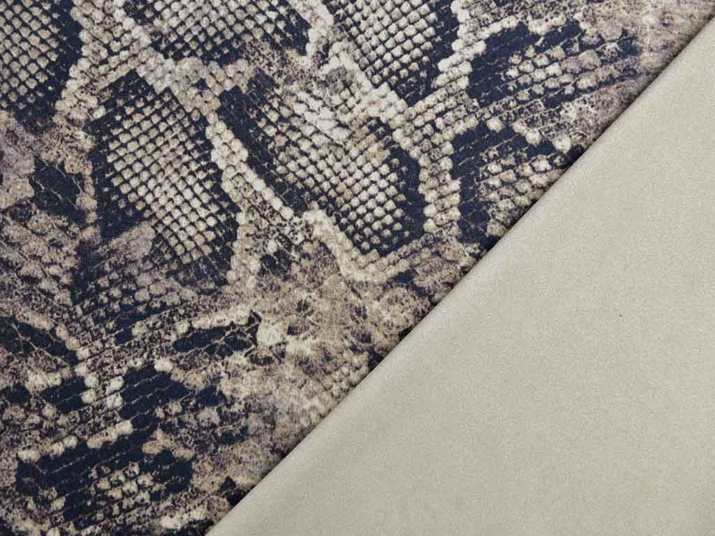 Ein leicht elastisches Wildlederimitat mit braun beige schwarzem Schlangenmuster. Die Oberfläche ist samtig weich und fühlt sich an wie Wildleder.