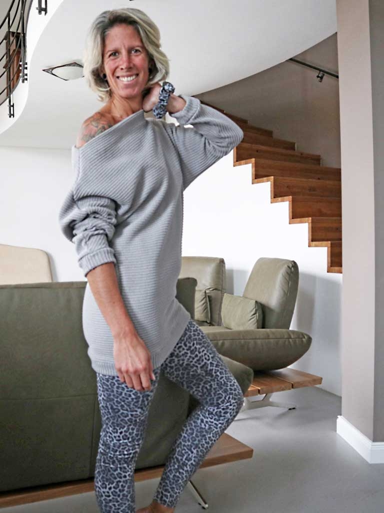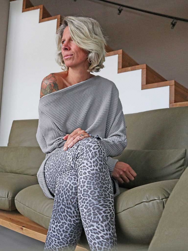 Ein leicht elastisches Wildlederimitat mit kleinem, grau-schwarzem Leomuster. Die Oberfläche ist samtig weich und fühlt sich an wie Wildleder.