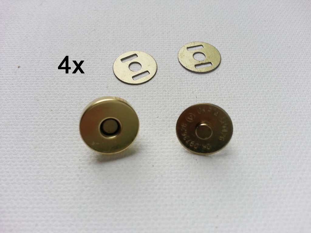 4 Magnetverschlüße in mattgold-farben für Taschen, Organiser, Rucksäcke, Täschchen, etc. Jeder Magnetknopf besteht aus 4 Teilen: 2 Magnete und 2 Gegenstücke.