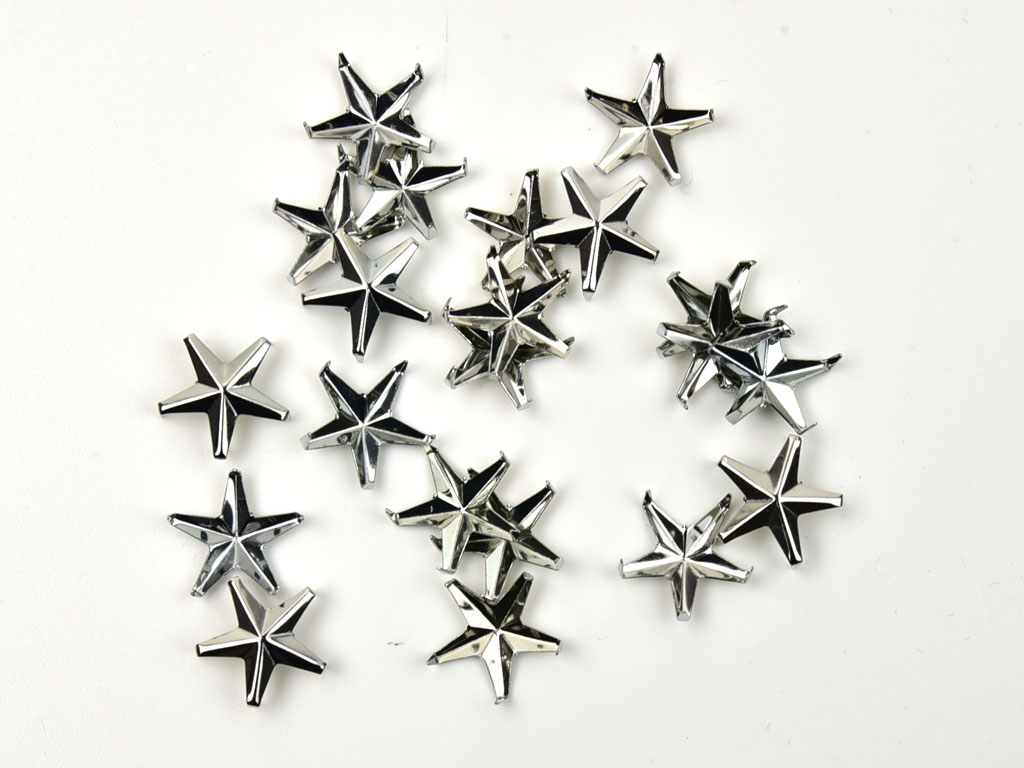 20 silberne Ziernieten in Sternform zum Durchstecken. Die Sterne sind 14 mm groß. Wie der Name schon sagt, werden sie zur Zierde benutzt.