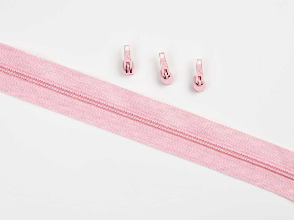 1 Meter endlos Reißverschluss mit 3 mm breiter Spirale in hellem altrosa inkl. 3 farblich passender Schieber. Der Reißverschluss hat eine Gesamtbreite von 2,6 cm und ist nicht teilbar. Der Schiebergriff ist 1,3 cm lang und der ganze Schieber 1,6 cm.