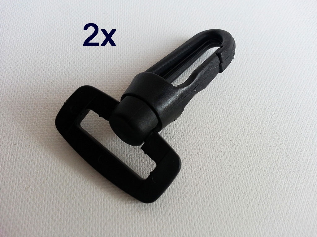 2 drehbare Karabinerhaken für Bänder in 2,5 cm (25 mm) Breite. Aus hochwertigem Kunststoff in schwarz.