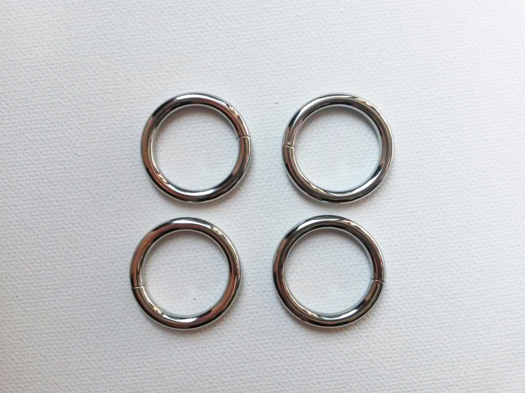 4 silberfarbene runde Ringe aus hochwertigem Metall für Bänder bis zu einer Breite von 20 mm (Innenmaß), der äußere Durchmesser beträgt 2,7 cm.