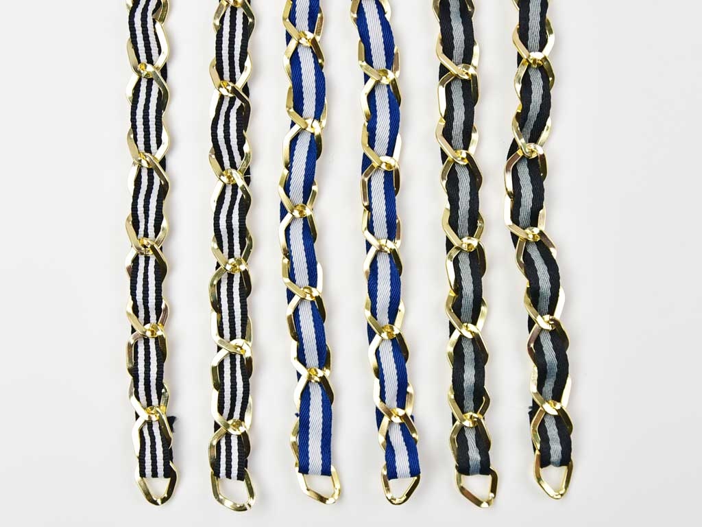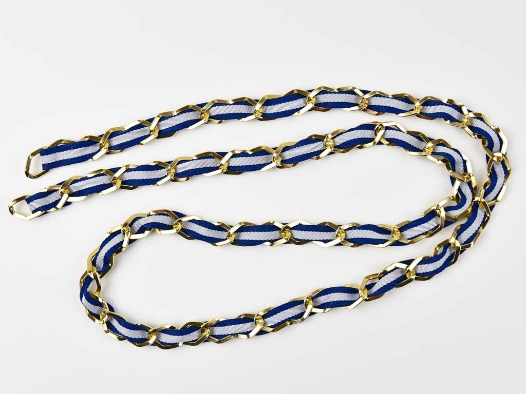 Eine 100 cm lange, goldfarbige Kette durchzogen mit einem marineblau weiß gestreiftem Ripsband. Ein Kettenglied ist 15 mm breit und 20 mm lang. Das Ripsband ist 10 mm breit. Die Taschenkette ist Nickel-frei.