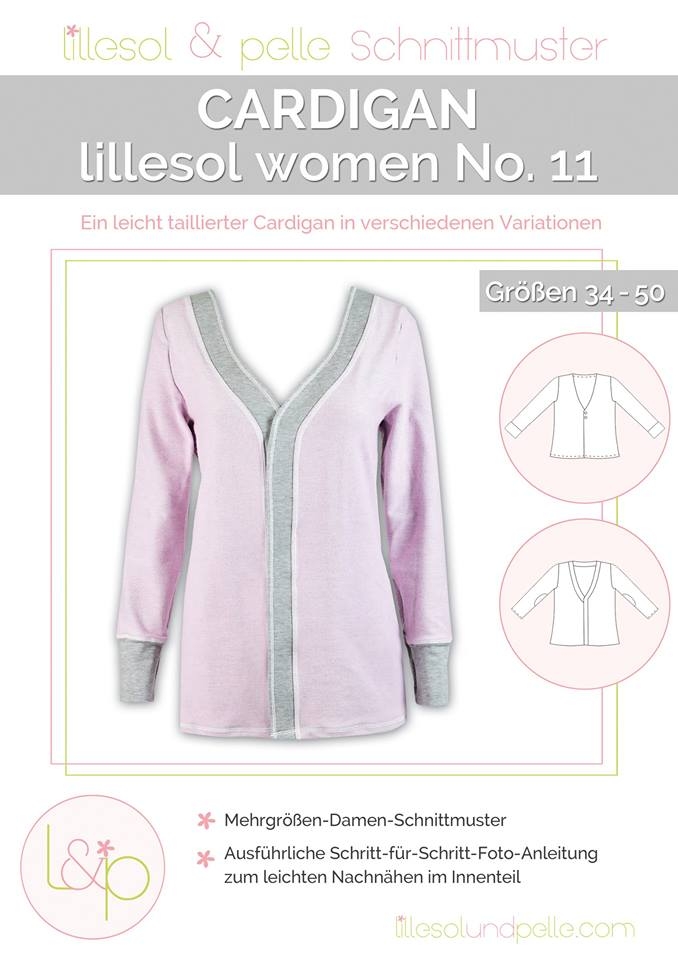Der lillesol women No.11 Cardigan ist eine leicht taillierte Jacke aus Jersey, die in verschiedenen Varianten genäht werden kann: Wahlweise komplett verstürzt genäht und somit von beiden Seiten tragbar oder einlagig mit Blende oder mit Beleg. Geschlossen wird die Jacke oben mit zwei Knöpfen und fällt vorne leicht auseinander. Auch eine durchgehende Knopfleiste oder gar keine Knöpfe sind machbar.